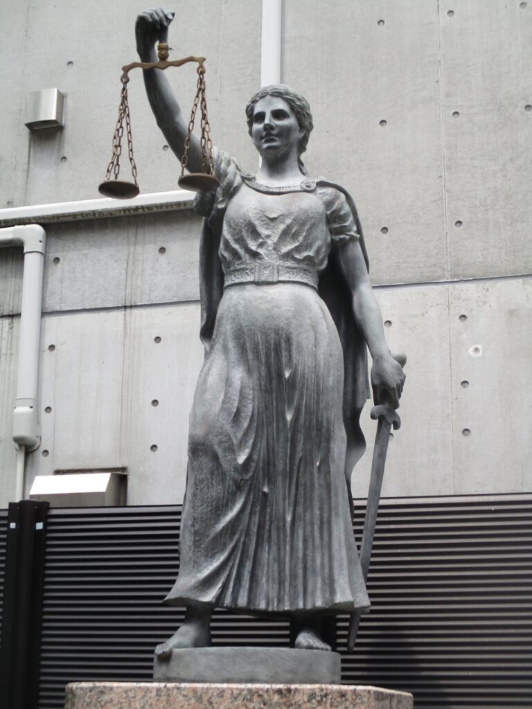 日本の最高裁判所にあるものは、右手で剣を突き上げ、左手に天秤を持っています。