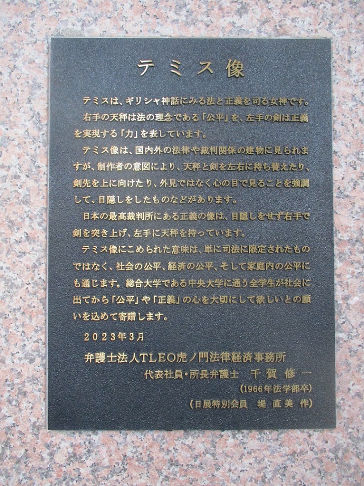 テミス像にこめられた意味は、単に司法に限定されたものではなく、社会の公平、経済の公平、そして家庭内の公平にも通じます。総合大学である中央大学に通う全学生が社会に出てから「公平」や「正義」の心を大切にして欲しいとの願いを込めて寄贈します。