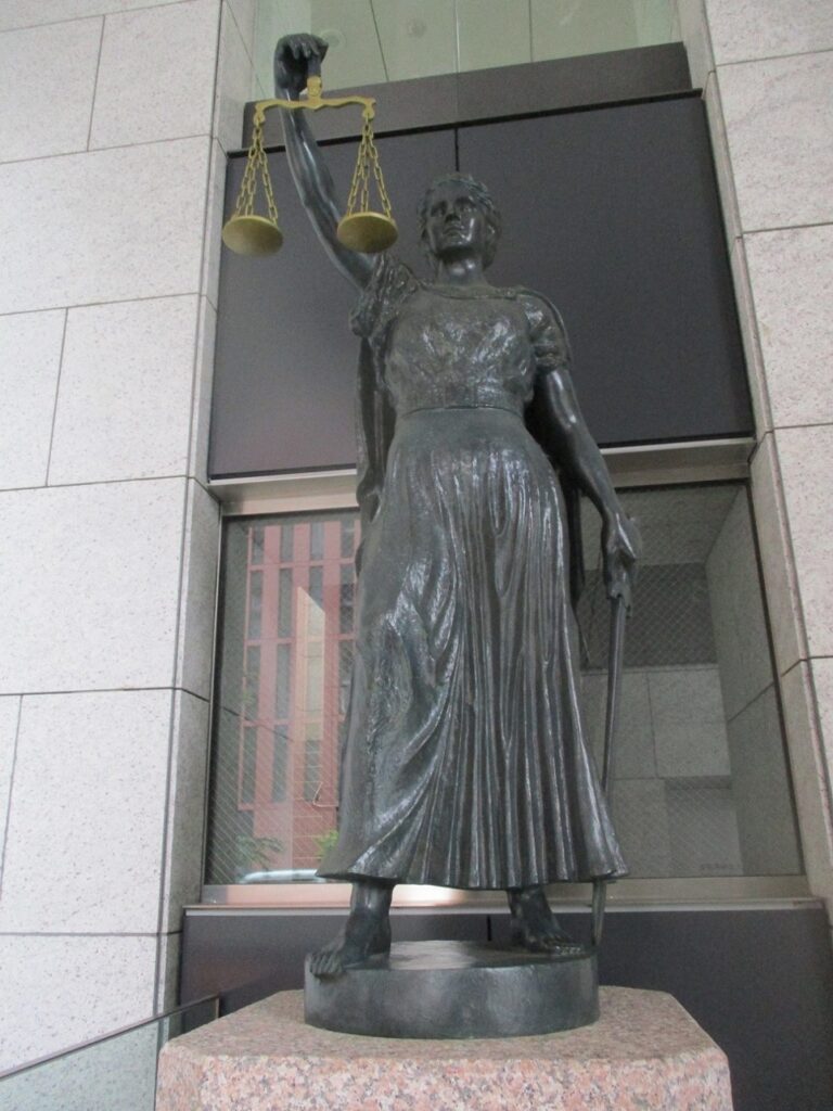 日本の最高裁判所にある正義の像は、目隠しをせず右手で剣を突き上げ、左手に天秤を持っています。