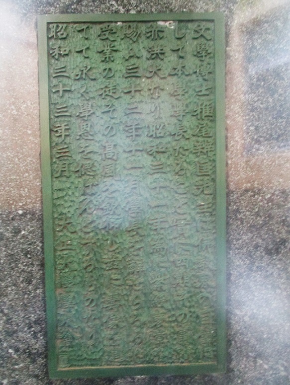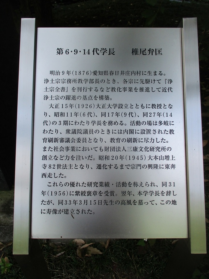 文学博士椎尾辨匡先生は佛教界の巨壁にして本學學長たること實に四期、その事績亦洪大なり。昭和三十一年為に紫綬褒章を賜ふ。三十二年十一月學長を解せらるる。受業の徒その高風を欽仰し茲に壽像を建てて永く學恩を偲ばんとするものなり。