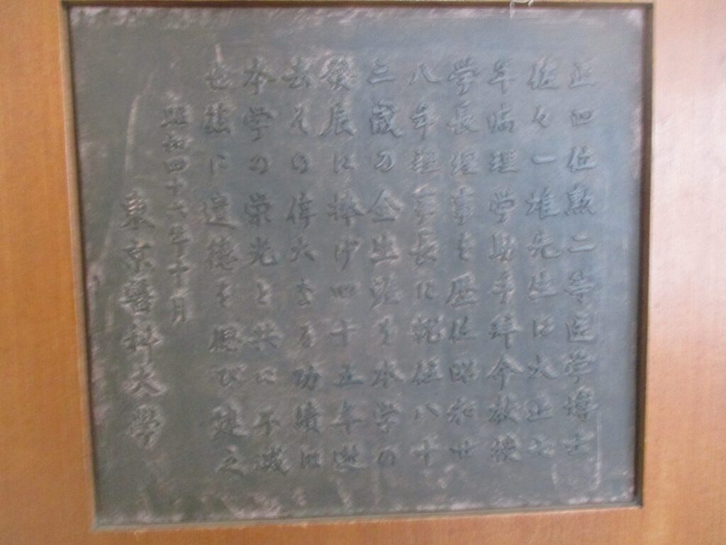 正四位勲二等医学博士佐々一雄先生は大正七年病理学助手拝命。教授学長理事を歴任、昭和廿八年理事長に就任。八十三歳の全生涯を本学の発展に捧げ四十五年逝去。その偉大なる功績は本学の栄光と共に不滅也。茲に遺徳を偲び建立。