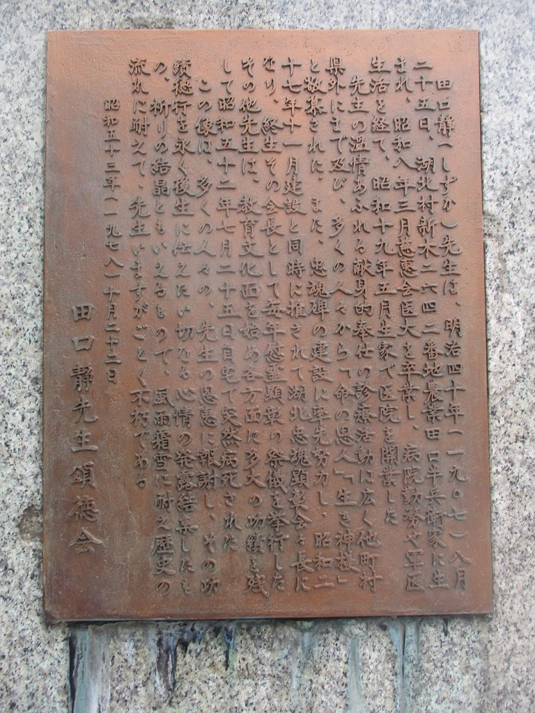 By 林 久治2025年10月9日Category: 00.乱歩(林久治), 12.千葉県の銅像, 東葛地域Tags: 医者 設置場所:千葉県我孫子市中里81-3 湖北地区公民館駐車場制作者:神野義衛(かみの・よしえ、 1919-?)制作時期:1978年10月22日画像提供:林久治⇒銅像探索記/f 設置経緯:田口 靜(しずか、1907年8月25日—1977年7月25日)先生は、千葉県東葛飾郡湖北村(現・我孫子市)に生まれ、1933年3月慈恵会医大を卒業し、病院勤務や軍医生活を経て、1944年5月当時無医村であった湖北村で開業。献身的に診療活動を行い、「我孫子の赤ひげ先生」と呼ばれて敬慕された。先の大戦中、明治から昭和初期のワキ方宝生流(下掛宝生流)の大名人・宝生 新が我孫子に疎開して来た時には、田口先生は「常葉会」という会をつくって、30名程の会員がワキ方宝生流の謡を習っていた。戦後は、忠魂碑の建設に率先努力し、1952年11月建設と同時に推されて湖北忠魂顕彰会々長になり、終生その会長として毎年慰霊顕彰の祭儀を挙行した。その他田口先生は、教育文化面を始め各方面に多大の功績を残した。 本像台座側面の碑文 設置場所:千葉県我孫子市中里81-3 湖北地区公民館駐車場