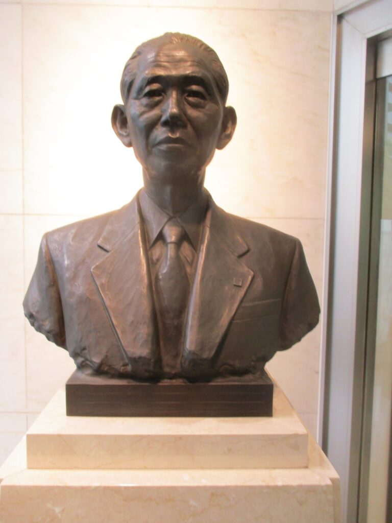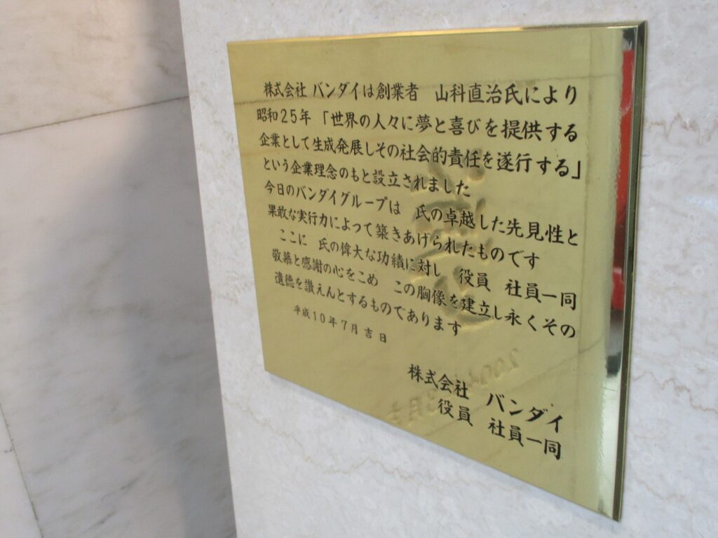 株式会社バンダイは、創業者山科直治氏により昭和25年「世界の人々に夢と喜びを提供する企業として生成発展しその社会的責任を遂行する」という企業理念のもとに設立されました。今日のバンダイグループは、氏の卓越した先見性と果敢な実行力によって築きあげられたものです。ここに、氏の偉大な功績に対し、役員、社員一同敬慕と感謝の心をこめ、この胸像を建立し永くその遺徳を讃えんとするものであります。