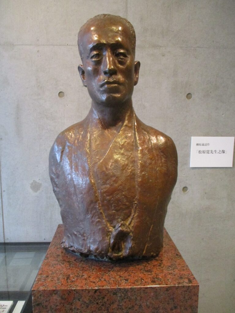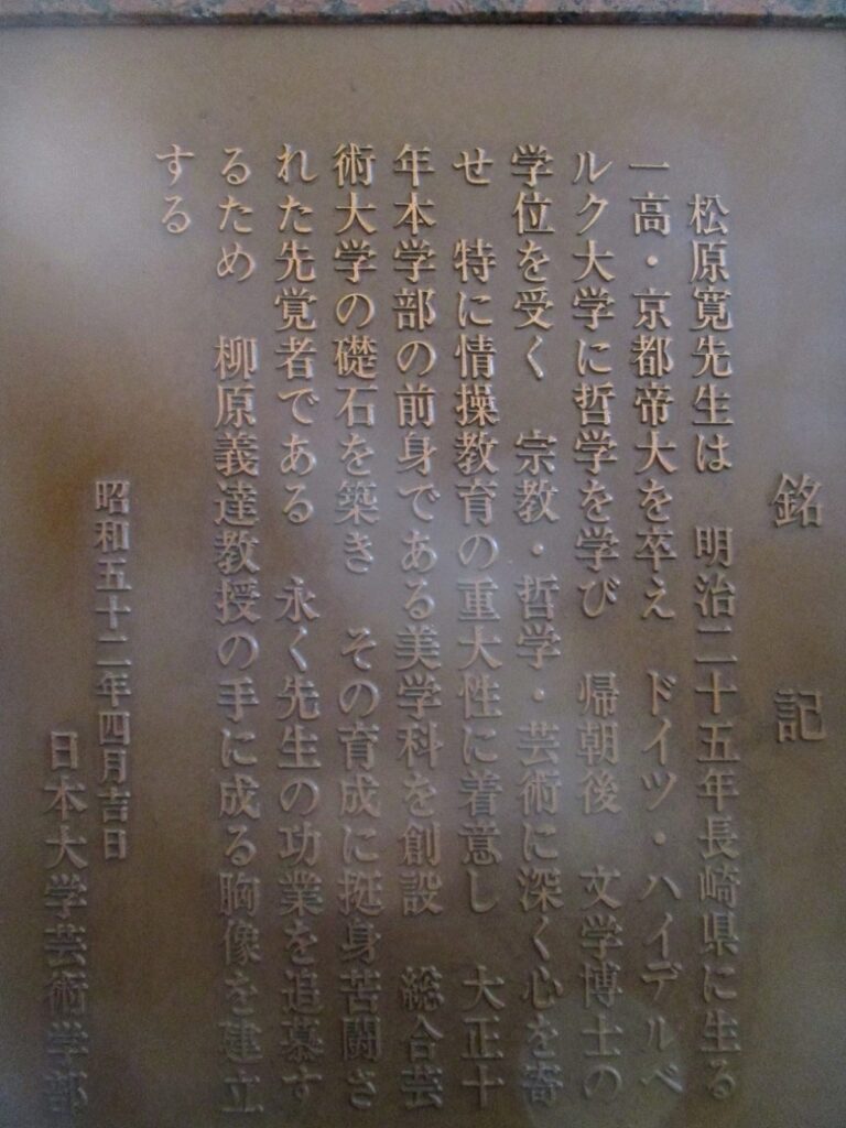 松原寛先生は、明治二十五年長崎県に生る。一高・京都帝大を卒え、ドイツ・ハイデルベルク大学に哲学を学び、帰国後文学博士の学位を受く。宗教・哲学・芸術に深く心を寄せ、特に情操教育の重大性に着意し、大正十年本学部の前身である美学科を創設。総合芸術大学の基石を築き、その育成に挺身苦闘された先覚者である。永く先生の功業を追慕するため、柳原義達教授の手に成る胸像を建立する。