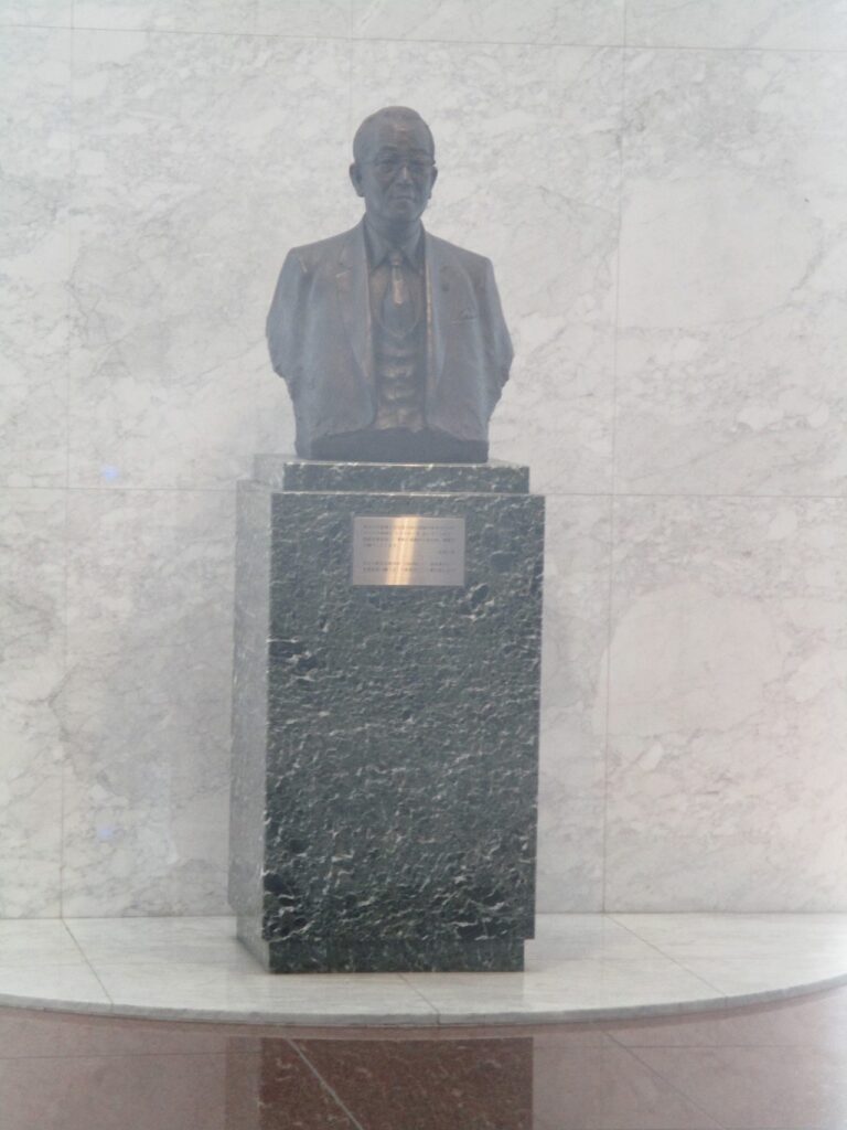 設置経緯:稲盛和夫(1932年1月21日 – 2022年8月24日)氏は、日本の実業家、技術者。京セラ・第二電電(現・KDDI)創業者。公益財団法人稲盛財団理事長。「盛和塾」塾長。日本航空名誉会長。鹿児島市薬師町に7人兄弟の次男として生まれる。父の畩市は「稲盛調進堂」という名で印刷工場を経営していた。1951年、大阪大学医学部薬学科の受験に失敗し、当時は新設大学であった鹿児島県立大学(後年鹿児島大学に統合)の工学部応用化学科で、有機化学を専攻した。1955年、鹿児島県立大学工学部を卒業。当時は旧帝大卒でも苦労するほどの就職難であり、新設大学の卒業生は相手にされなかった。そこで専攻を無機化学に変更し、教授の紹介でがいしメーカーの松風工業に入社した。担当になった磁器の研究に没頭し成果を上げた。これが会社の業績に繋がったが、技術開発の方針で上司と衝突したことをきっかけに、稲盛が会社に頼んで採用した部下8人を引き連れて1958年12月に退社、翌年京都セラミツク(現・京セラ)を京都市中京区西ノ京原町で創業する。本像の建立は、京セラが創立25周年を迎えた1984年に、「四半世紀にわたって指導してくれた稲盛に感謝の気持ちを伝えたい」と、多くの社員有志が基金を拠出したことから始まります。1998年の京セラ新本社建設に際して、ロビーや公開空地に彫刻作品を展示することが計画され、現代具象彫刻の第一人者と言われ、稲盛の母校鹿児島大学で教鞭をとられていた中村晋也氏に制作を委任。本像も中村教授により制作された。