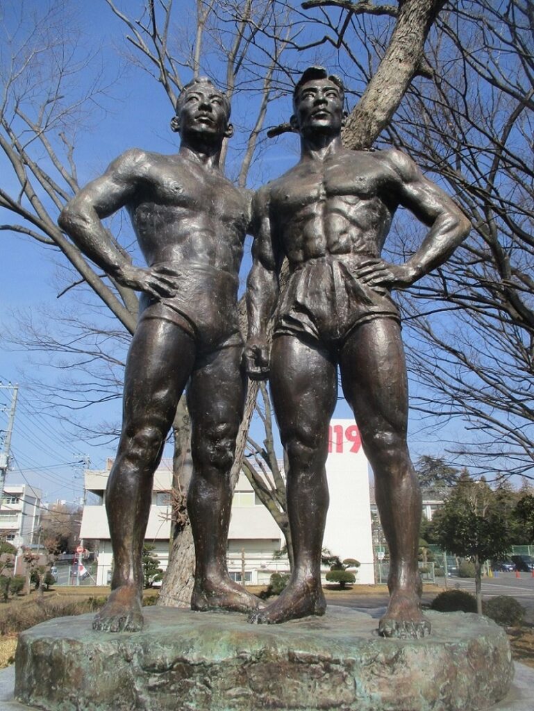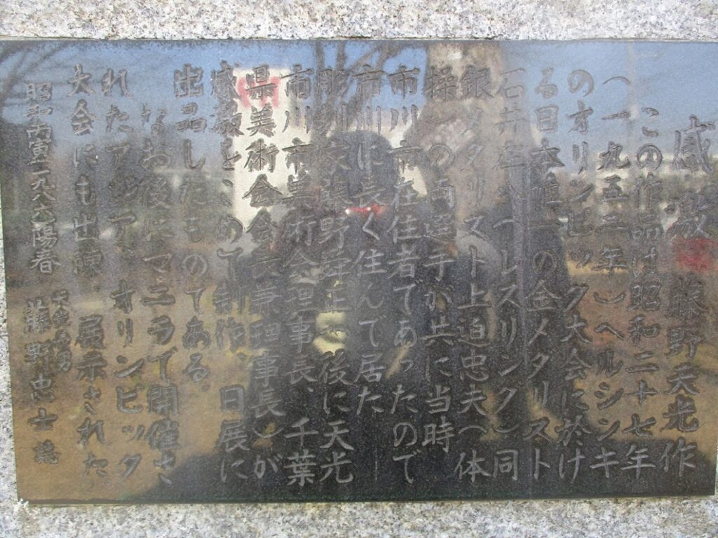 この作品は昭和二十七年(1952年)ヘルシンキのオリンピック大会に於ける日本唯一の金メダリスト石井庄八(レスリング)同銀メダリスト上迫忠夫(体操)の両選手が当時市川市在住者であったので市川市に長く住んで居た彫刻家藤野舜正(後に天光、市川市美術会理事長、千葉県美術会会長兼理事長)が感激をこめて制作、日展に出展したものである。なお後にマニラで開催されたアジアオリンピックにも出陳、展示された。