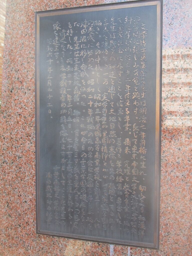 文学博士遠藤隆吉先生は明治七年前橋に生まれ、幼少より和漢洋の学問に親しみ才覚を顕わす。長じて東京帝国大学文科大学哲学科に学び明治三十二年同学を卒業。爾来、究理と教育事業に拠って国家社会に尽くすことを信条とし、著作と学校経営に専念した。先生は幾多の論述を通じて天地自然の実体を生の根拠とする生々主義を提唱する一方、実学尊重の学園精神をかかげて巣鴨学園を拓き、その中核として昭和三年巣鴨高等商業学校を創立し、人材の養成に努めた。昭和二十年戦禍のため学舎は灰燼に帰し本拠を津田沼に移し命脈を保った。これが今日の千葉学園の基石をなした。先生は生来豪放磊落。始終、官を望まず民を重んずるの態度を持した。昭和二十一年二月五日、七十有三歳の生涯を終わる。偉大なる本学創設者の功績を偲ぶよすがとしてここに先生の像を建立す。