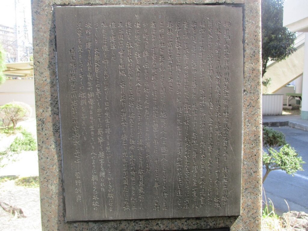 柳井淑人先生は旧川越藩士柳井経定氏の次男である。埼玉懸立川越中学校を卒業して川越南尋常小学校に奉職した。そのまじめな人がらは教職員や父母から深い信頼を受けそのやさしい愛情は児童から父のようにしたわれた。明治三十九年九月二十日古谷村荒川沿岸で郊外学習中一人の児童が脚をすべらせて河の中に落ちた。先生はすぐ奔流に身を躍らせた。一度は児童を抱いて水面にあらわれたが激流に妨げられ必死の努力も空しくついに河底に呑まれ教え子に殉じたのであった。時に先生は二十一才人生の半ばにも達しない春秋に富む青年であった。