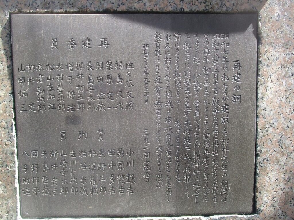 昭和七年に私たちが建設した柳井先生の銅像は昭和十八年二月十一日戦争のために供出せねばならなかった。その後平和のおとずれとともに銅像再建の意見がたちまち起り少数な會員ではあるが精神的に結合した私たちは彫塑界の鬼才木村珪二氏に依頼して前にまさる銅像をつくりあげることができた。永久に朽ちぬこの像魂は本校児童はもちろん廣く教育界にまた社會に無言のおしえを與えると思ふ。