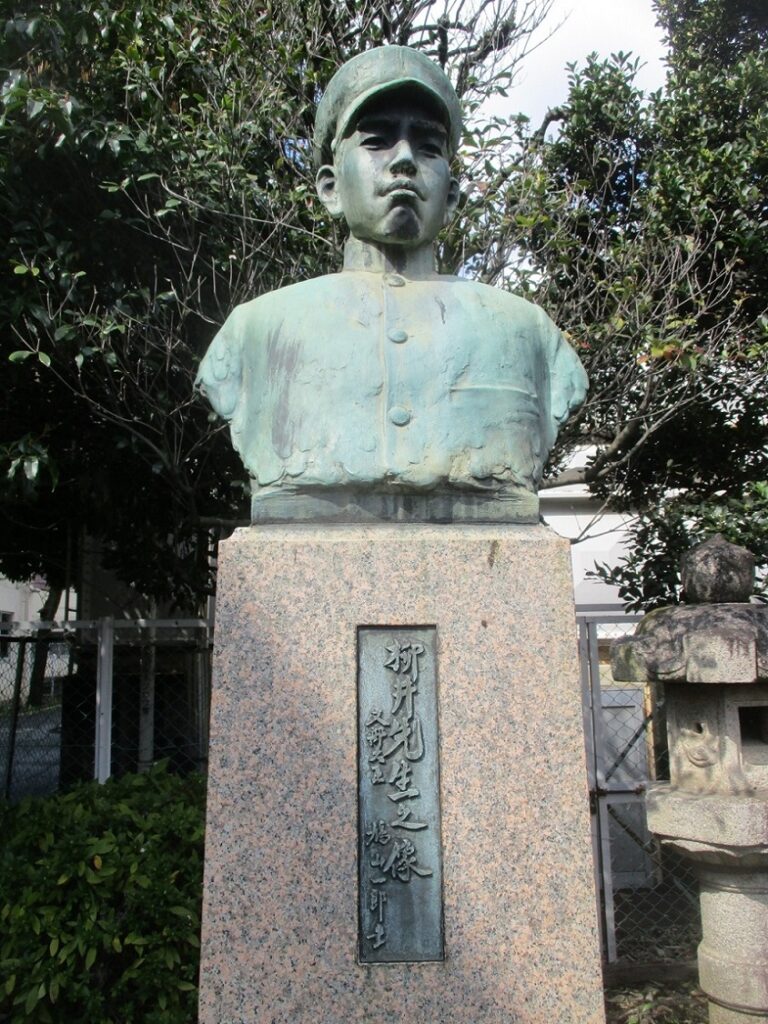 柳井淑人(やない・よしんど、1885年-1906年9月20日)先生は、川越藩士柳井経定氏の次男。川越中学卒業後、川越南尋常小学校に奉職。1906年9月20日に、校外学習で古谷地区に行き荒川の電車架橋の見学をした際に、一人の児童が荒川に墜落するという事故があった。引率していた柳井先生は、川に落ちた生徒を救わんと、すぐさま激流に飛び込みましたが、前日の大雨で流れが急だったこともあり、2人は助かることなくそのまま流されてしまった。