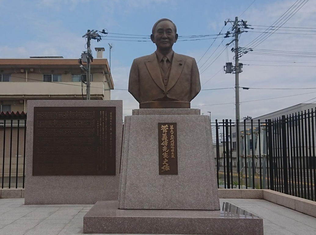場所:湯沢市表町2丁目 JR湯沢駅前建立年月日:画像提供:城月さん 第99代内閣総理大臣 台座には、官房長官時代の「令和」を国民に知らせる姿のレリーフもある
